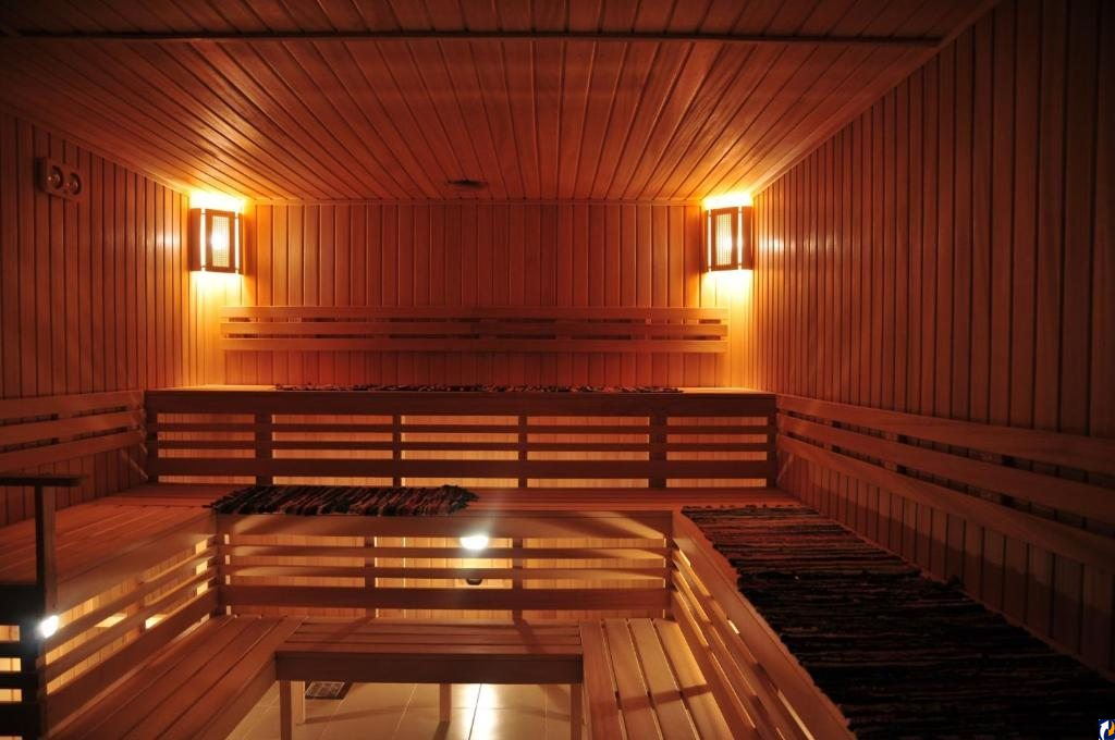 Сауна. Она позволит расслабиться, а натуральное покрытие сделает здесь ваше пребывание еще и полезным для здоровья. За такой размах, удобные полочки, а также мягкий приглушенный свет можно простить и отсутствие ванны в домике.
