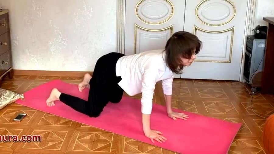 Делаем выдох и на вдохе становимся на четвереньки. На выдохе возвращаемся в позицию Собака мордой вниз. Повторить 3-5 раз.
