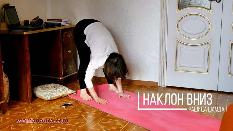 Опираясь руками на пол, плавно входим в вытянутый наклон к стопам — «Уттанасану». Ставим ладошки перед собой. Чуть прогибаемся, посмотрели вперед.
