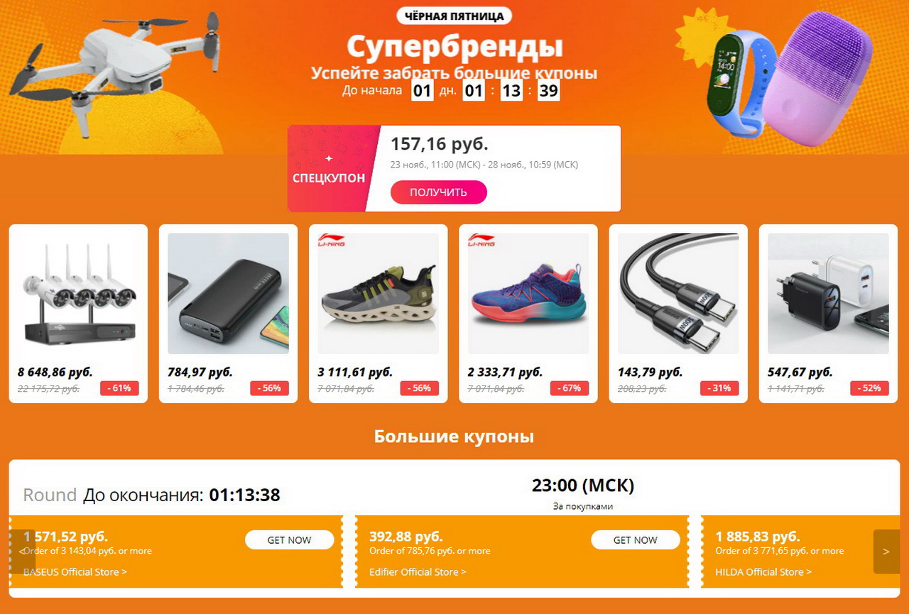 Скидки к Black Friday на AliExpress будут видны за неделю до старта распродажи. Отслеживать лучшие предложения и промокоды можно на главной странице – вот тут.