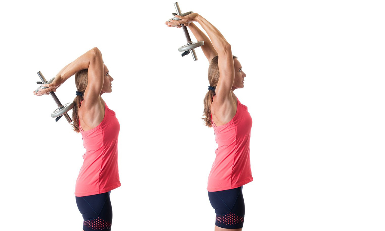 Встаньте прямо. Обеими руками возьмите гантель и опустите ее за голову. При выдохе поднимайте снаряд вверх, а при вдохе возвращайтесь в исходное положение.
