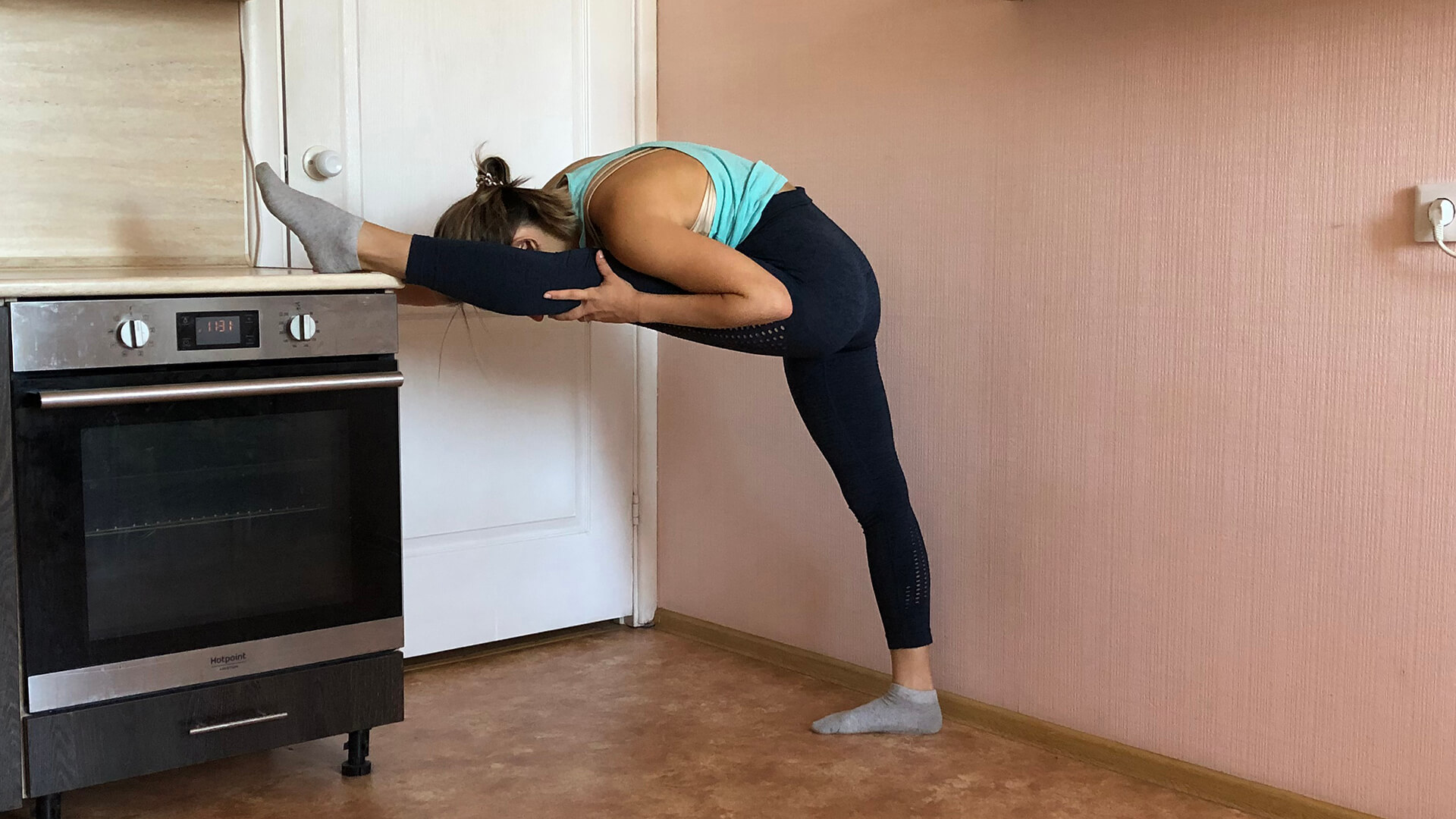 - Теперь нам понадобится стул или стол. Положите одну ногу на стол и встаньте прямо. Начинаем медленно делать наклон вперед. Ноги в коленях не сгибаем. Пытаемся наклониться как можно ниже. Задерживаемся на 10 секунд и встаем. Потом меняем ноги и повторяем упражнение.