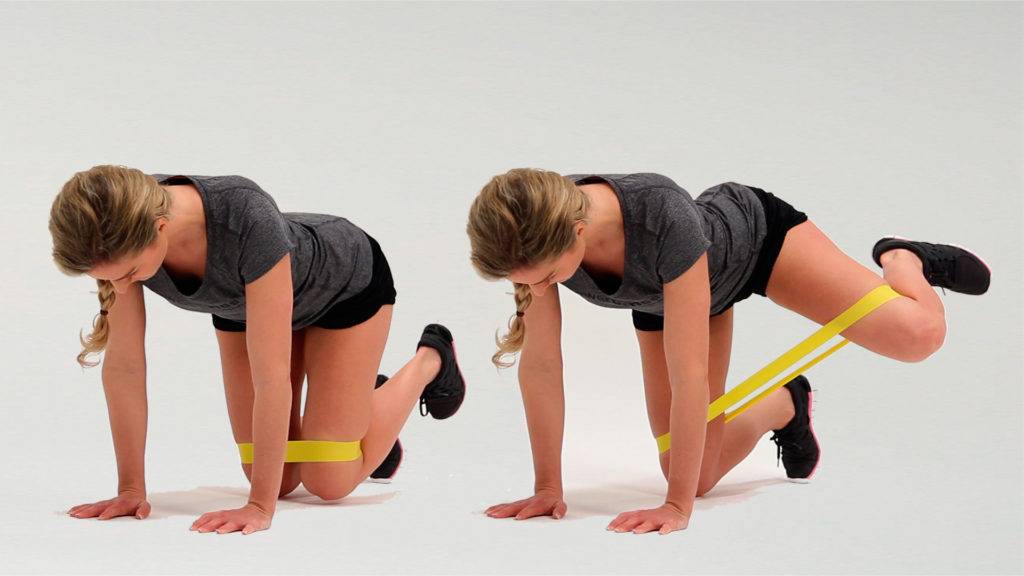Не меняйте положение на четвереньках с установленными на пол локтями. При этом ноги расположите рядом друг с другом. Спина прямая, а взгляд вниз. Одну ногу поднимите вверх, пока бедро не доведете до линии корпуса. Угол в колене сохраните. Теперь из этой позиции начните делать пульсирующие движения, то поднимая, то опуская ногу. Амплитуда совсем небольшая. Затем повторите этот вид махов другой ногой. В этом упражнении идет непрерывная нагрузка на ягодичные мышцы.