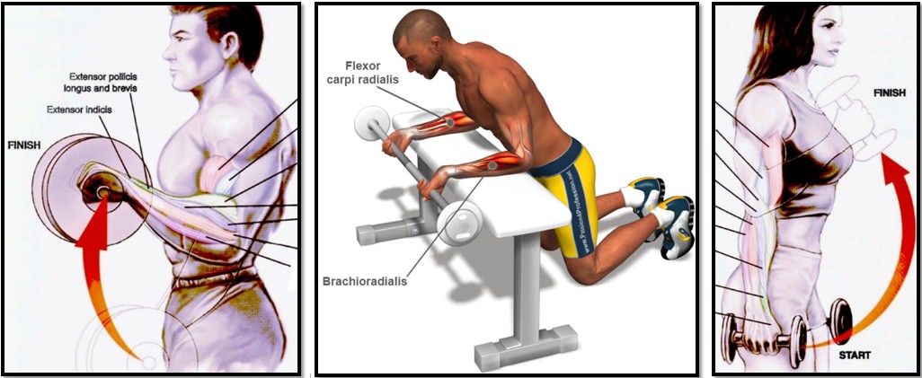 Плечелучевая (брахирадиалис) мышца активно включается в работу при подъеме гантелей хватом молоточек, т.е. когда большой палец смотрит вверх. Клювовидная мышца играет далеко не последнюю роль в развитии ручной мускулатуры и хорошо просматривается при позе двойной бицепс спереди. По клювовидной мышце лучше всего “бьют”: подъемы гантелей перед собой, разведения гантелей лежа на скамье.