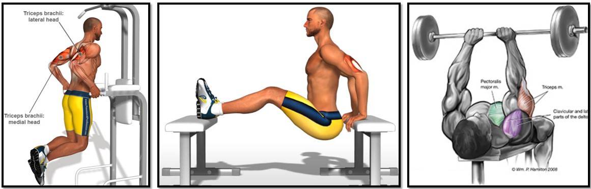 Для качественного развития трехглавой мышцы плеча необходимо использовать именно сгибающие/разгибающие упражнения со свободным весом. Под качеством подразумевается увеличение объемно-силовых характеристик данной мускульного группы. Не стоит уделять время изолированным тренажерам (парни, оставьте их девушкам) лучше использовать многосуставные упражнения в которых сразу “захватываются” в работу все 3 головки трицепса.