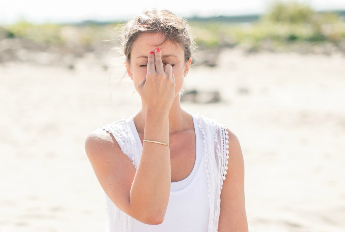 - Поместите средний и указательный пальцы правой руки на лоб, в точку между бровями. Большим пальцем этой же ладони закройте правую ноздрю.