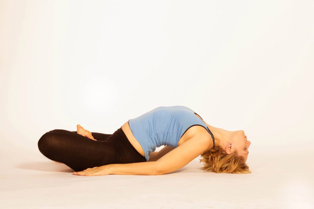 . Эта упрощенная поза рыбы подходит для новичков. Лягте на спину, упираясь локтями в пол, выпрямите ноги. Руки можно положить под бедра, чуть ниже ягодиц. На выдохе изогните спину дугой, опираясь на локти. Изгиб спины должен быть максимальным, но не причиняющим боли. Ноги держать вместе. Глубоко вдохните 2- 8 раз. Новичкам можно подложить под прогиб спины свернутый плед.