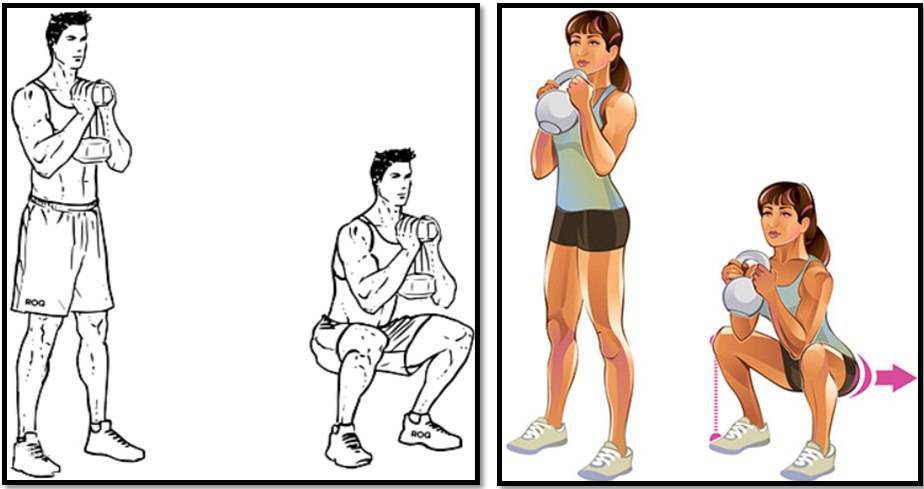 - приседания с гирей, удерживаемой внизу на вытянутых руках;
