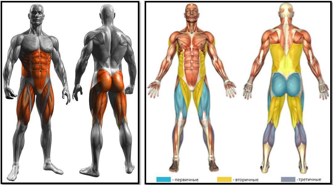 Как говорилось выше – работу выполняют те же самые мышечные группы, которые задействованы и при классическом приседе. Сюда относятся мышцы задней (бицепсы) и передней (квадрицепсы) частей бедра, а также большие ягодичные мышцы.