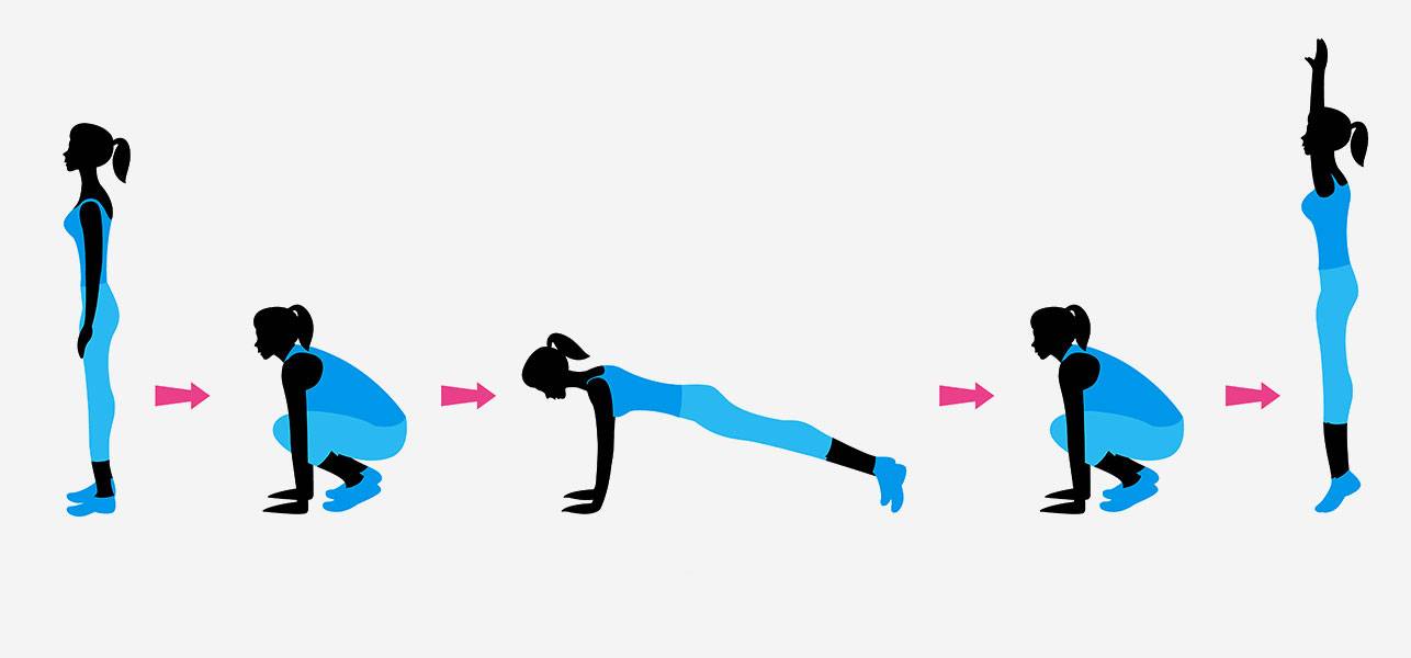 Суть заключается в выполнении 6 движений подряд. Из положения стоя нужно присесть, в прыжке отбросить ноги назад, приняв положение планки, отжаться, прыжком подтянуть ноги, и из положения сидя выпрыгнуть, сделав хлопок над головой. Максимальная нагрузка идет на мышцы ног и бедер, но задействованы почти все группы мускулов, тренируется все тело.