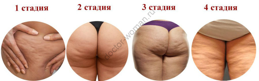 Типы апельсиновой корки зависят от стадии ее развития, способа ее образования и твердости кожи. Чаще всего целлюлит делится на четыре стадии развития: