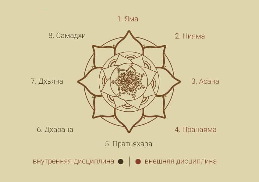 - Нияма — это самодисциплинирующие добродетели, обращенные к самим себе — самодисциплина, стремление к самосовершенствованию, чистота, удовлетворенность, скромность в мыслях и действиях.