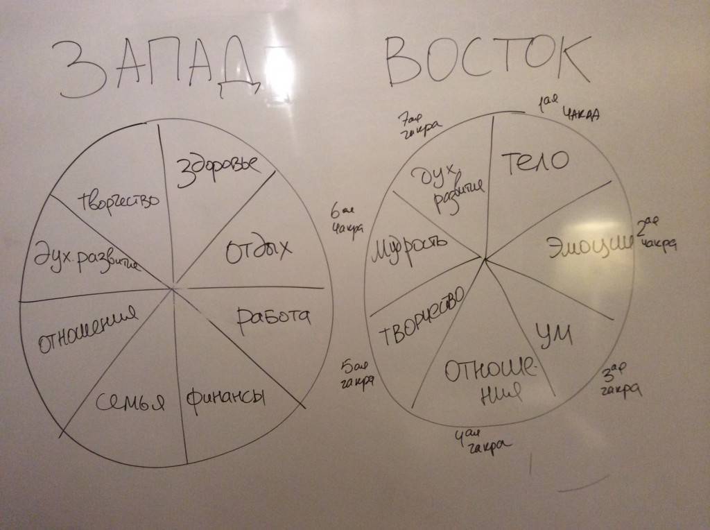 Если вы посмотрите, то можете увидеть, что восточная система крайне напоминает сферы баланса западной (см. картинку колеса баланса ниже0. И мы можем поместить чакры точно так же в колесо баланса, я называю это колесо – чакральное колесо баланса. Расположив чакральные сферы, это не геометрические шарики, это сферы проявления человека в различных областях. Мы их расположим в виде колеса, то в западном колесе у нас 8 секторов, а в восточном у нас будет 7 секторов. И отсюда уже из этого понимания вы можете сообразить, каким образом вы можете развивать, гармонизировать себя.