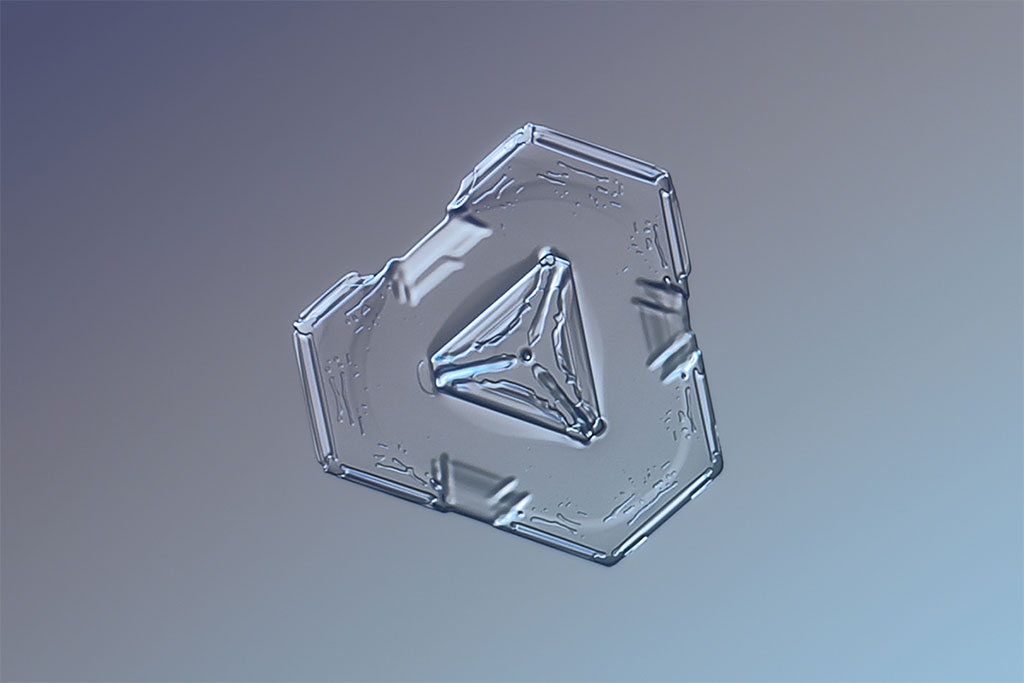 Треугольные кристаллы. Такие снежинки обычно формируются при температуре около -2ºC.