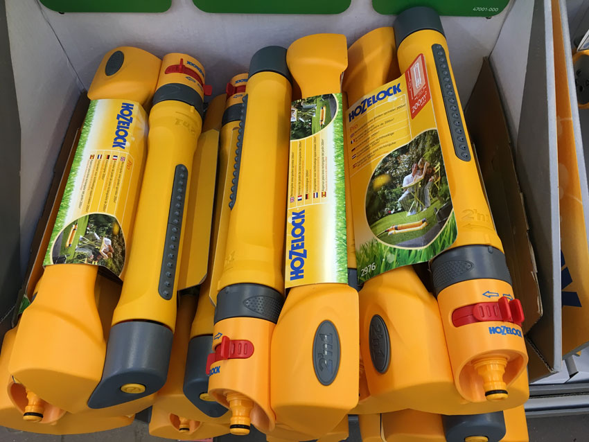 Многие люди и мы не исключение, придерживаются правила не покупать самый дешевый товар. Равно, как и самый дорогой. Нас приучили искать золотую середину, вот мы и нашли. Сначала решили купить дождеватель фирмы Hozeloсk. Он не только был примерно в середине ценового диапазона – 1800 руб., но и имел красивый желтый цвет. Одно слово – золотая середина.