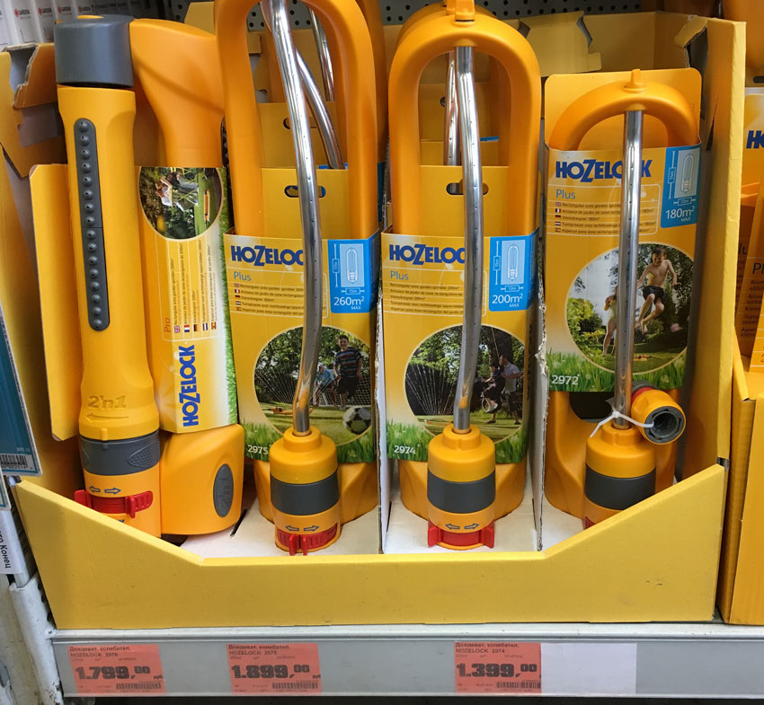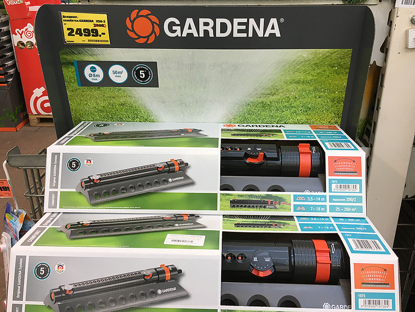 Среди осциллирующих дождевателей в наличии были совсем простые и дешевые модели стоимостью от 400 рублей. С другой стороны красовалась поливалка фирмы Gardena за 2500! Вообще, она стоила на тысячу дороже, просто в этот день на них была акционная скидка.