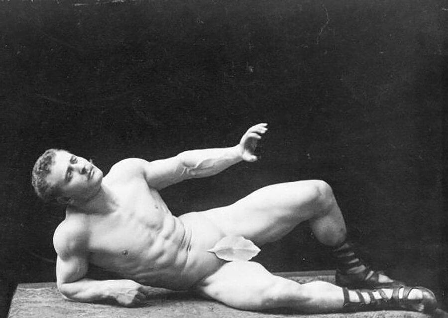 Сандов изображает скульптуру Умирающий галл, символизируя греческий идеал красоты