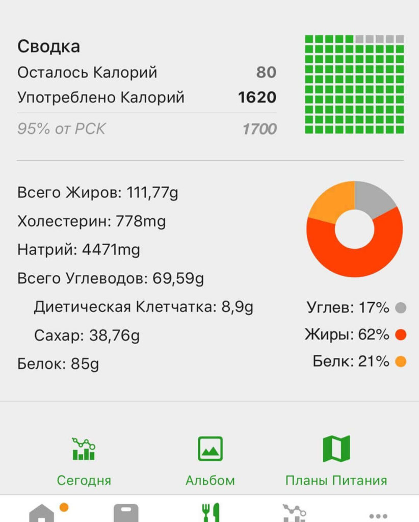На деле Вам выйдет диаграмма в %, в которой программа за Вас сосчитает БЖУ в граммах (разными цветами обозначают белки, жиры, углеводы) и общую суточную калорийность.