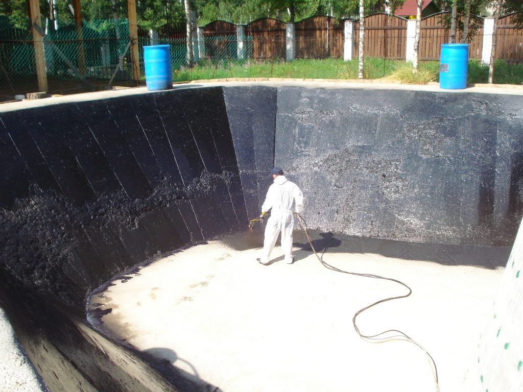 Дальше (после очистки поверхности от пыли, грязи и прочего мусора) внутренняя чаша бассейна покрывается слоем битумной мастики – она должна хорошенько впитаться в бетонную поверхность. После ее нанесения нужно следить за тем, чтобы ни пыль, ни грязь больше не попадали внутрь чаши.