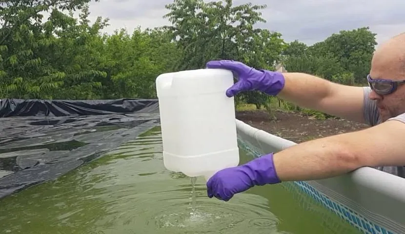 Дезинфицирующий состав наливают в садовую лейку или пластиковую канистру. Проливают из нее по периметру бассейна. Система фильтрации при этом должна работать, чтобы пергидроль быстрее перемешивался и распределялся по всему объему.