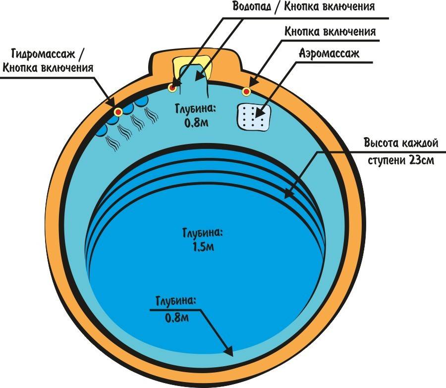 Важно выбрать место так, чтобы не возникало трудностей с наполнением чаши водой, а затем и ее сливом. Предусматривается наличие рядом водопровода и канализации или возможности доступа к ним при помощи дополнительных шлангов
