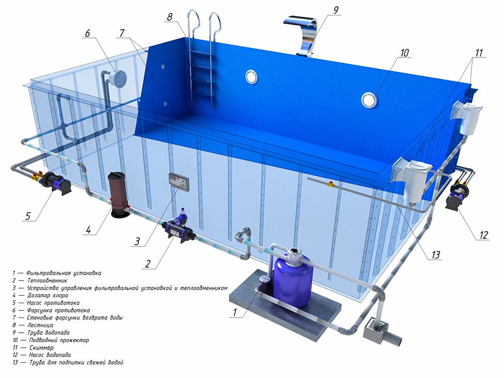 Именно на основании того, для чего будет использоваться конструкция, необходимо делать расчёты глубины. Стандартным оборудованием, которое используется в большинстве бассейнов является: