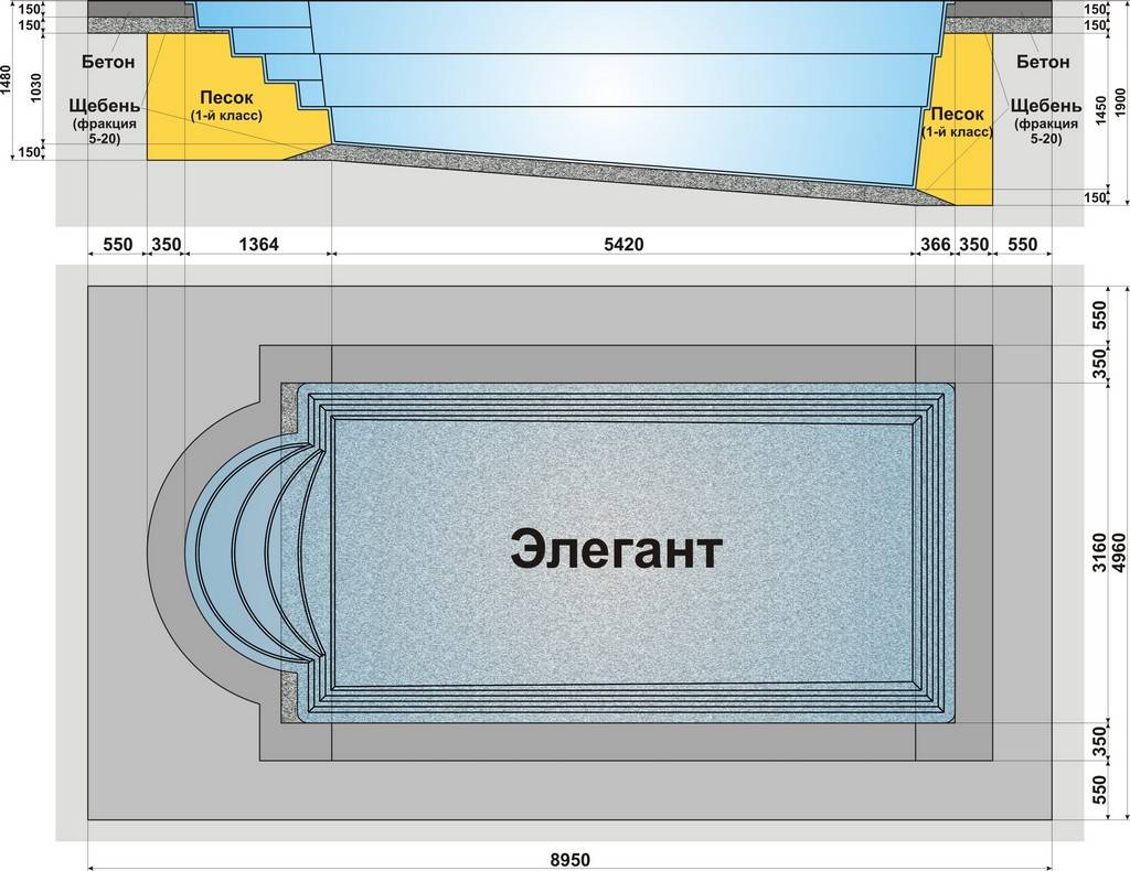 Если искусственный водоем планируется использовать не просто для водных процедур, а для полноценного плавания, то габариты должны быть принципиально другими — не менее 2,5 метра в ширину, 5,5 метров в длину. При меньших параметрах плавать просто будет негде.