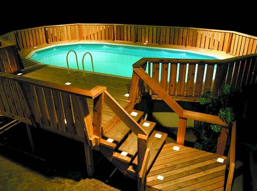 - Летом на фундаменте настилают из досок помост. Организовывают площадку для отдыха возле каркасного бассейна.