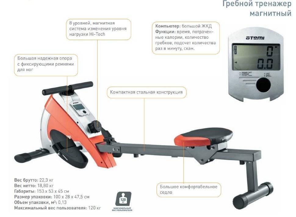 Регулировка нагрузки бесступенчатая. Обычно набор параметров, регистрируемых компьютерным блоком, невелик: время тренировки, количество гребков, расход энергии.