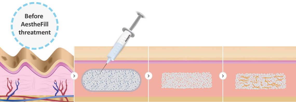 Дермальный филлер AestheFill представляет собой субстанцию из микроскопических сферических пористых частиц ПМК. В организм пациента кислота попадает в виде инъекционного суспензионного раствора, легко распределяющегося во внутрикожном слое. Микроскопические сферы растекаются, заполняя свободные участки эпидермиса в оптимальном количестве. Пористая структура поглощает вещества, участвующие в коллагеновом синтезе. После растворения мембран сфер, длящегося несколько месяцев, на участке введенного препарата остается коллаген.