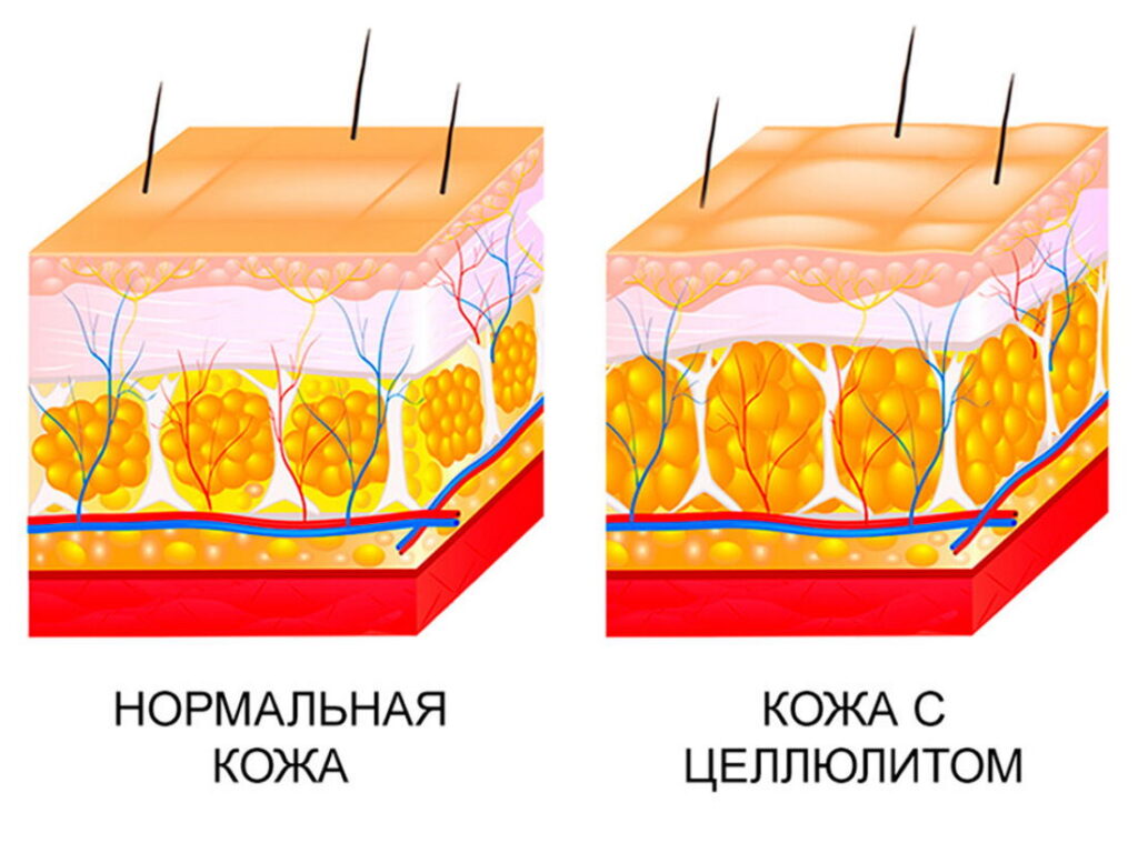 Жировая прослойка, образованная ячейками из волокон, которые соединяют верхний слой кожи с глубокими тканями, и образует ту самую бугристую поверхность. Если происходит увеличение объема жировых клеток (адипоцитов), то это сразу нарушает гладкость кожи; ячейки начинают выделяться, формируются бугорки и ямочки.