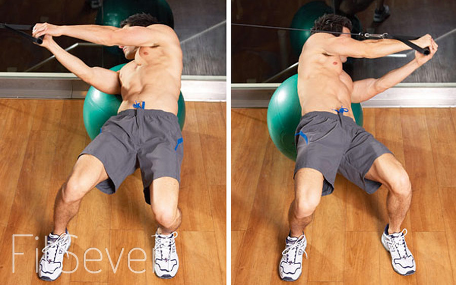 Лежа на фитболе, возьмитесь за рукоятку блока двумя руками. За счет вовлечения косых мышц живота в работу начните медленно отводить эту рукоятку в противоположную сторону. Задержитесь в финальной точке на 10-12 секунд. Выполните 7-10 повторов упражнения со средним рабочим весом.
