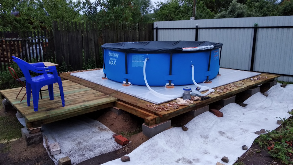 За новые строительные материалы придется выложить некоторую сумму. Если на участке имеются поддоны, их можно использовать для изготовления помоста для бассейна. Оптимально было бы поддоны разобрать на доски.