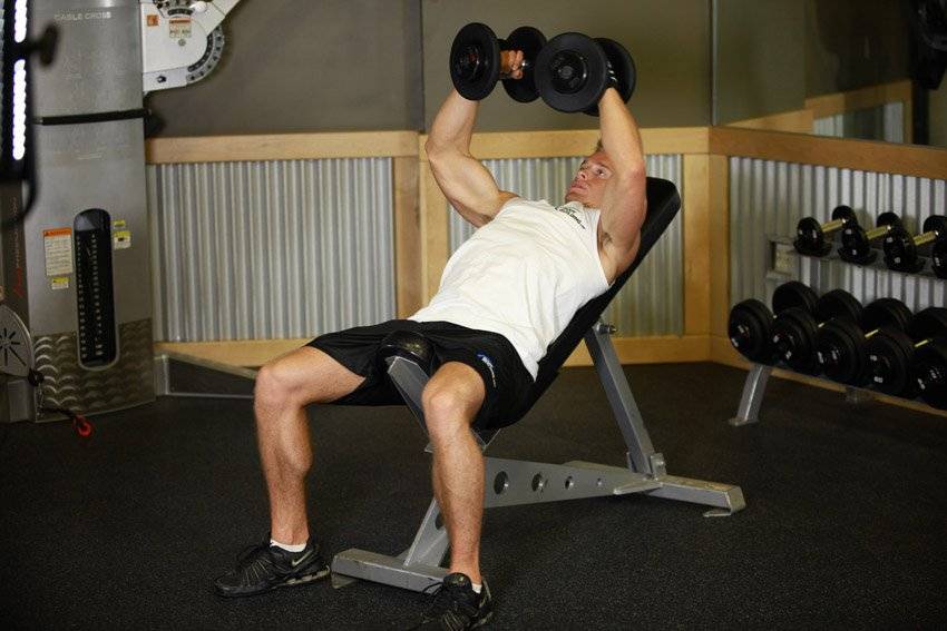 - Жим гантелей на наклонной скамье: 5-6 подходов х 6-12 повторений.