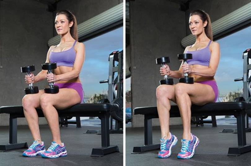 Сядьте на стул или фитбол. Руки с утяжелениями положите на колени. Поднимите ноги на носочки и замрите в этом положении на 2-3 секунды, а затем опустите пятки обратно на пол. В этом упражнении упор делается на камбаловидную мышцу. Пример того, как накачать икры, сидя на фитболе, вы можете увидеть на фото.