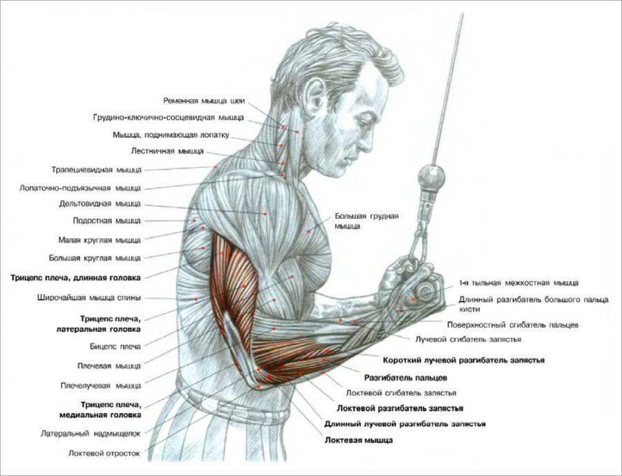 С анатомической точки зрения в упражнении принимает участие вся группа трицепса, дельтовидная мышца и верхняя часть грудной.