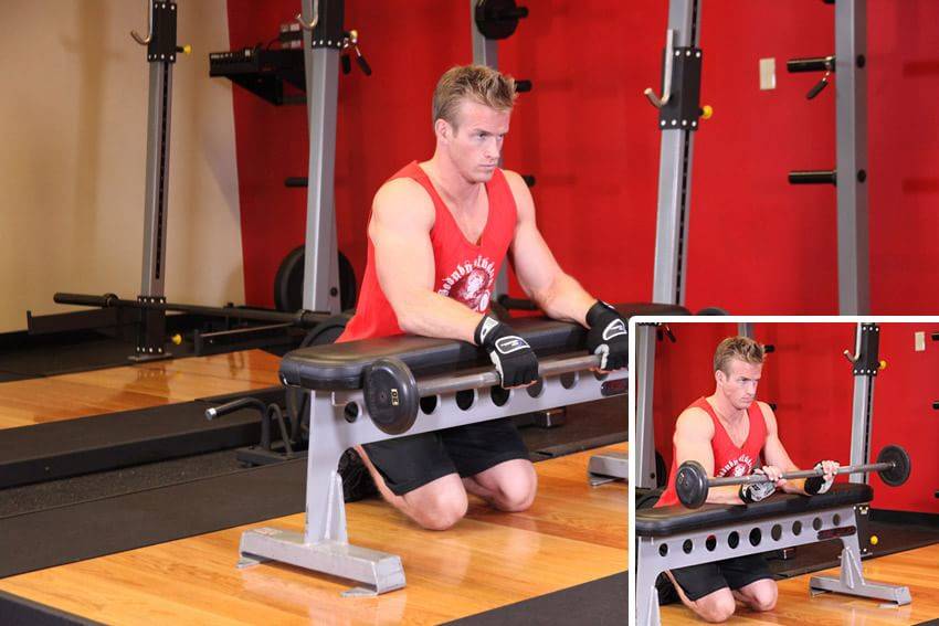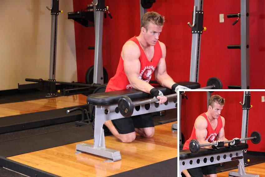 - Медленно согните руку на бицепс, как если бы вы делали это стоя. Вся нагрузка должна ощущаться от локтей. Не напрягайте верхнюю часть туловища, чтобы облегчить выполнение упражнения.