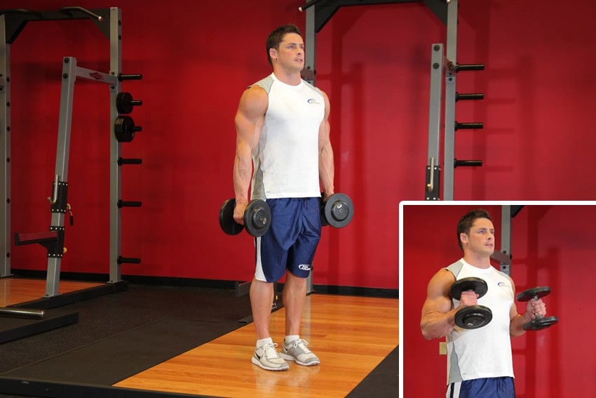 - Одновременно поднимите обе гантели. Не поворачивайте руку в стороны. Должно выглядеть так, словно вы замахиваетесь двумя молотками.