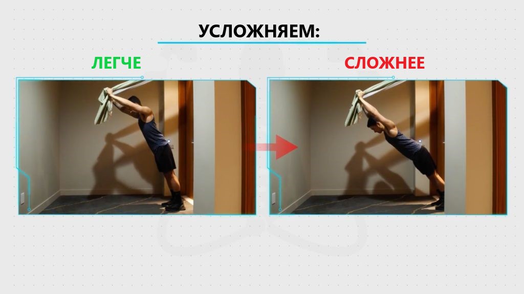 Новичкам рекомендуется становиться подальше от двери, чтобы тело не наклонялось так сильно вперед. Затем, когда вы станете чуть сильнее и уверенней, двигайте ноги ближе к двери, чтобы тело могло наклоняться по максимуму вперед. На начальных этапах можете сузить диапазон движения, затем постепенно увеличивать его, позволяя рукам двигаться дальше над головой.
