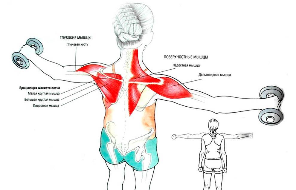 Расположите ноги на ширине плеч, возьмите гантели и слегка согните руки в локте. Корпус должен быть прямым и неподвижным. На выдохе поднимите гантели в стороны до уровня плеч. Задержитесь в этом положении и на вдохе плавно опустите руки в исходное положение. Избегайте рывков.