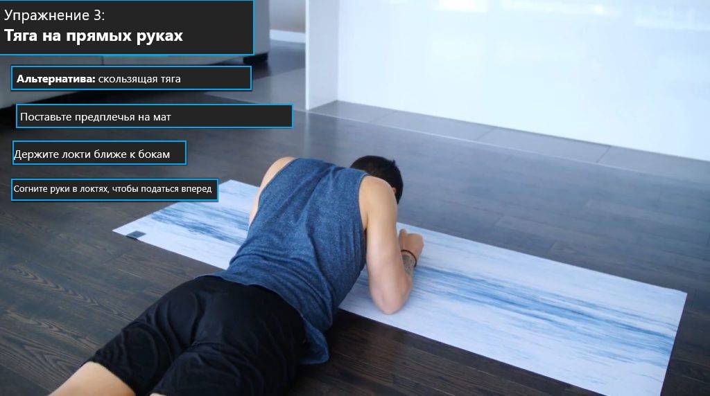 - затем, придерживая локти близко к бокам, согните руки, подаваясь туловищем вперед и скользя по полу.