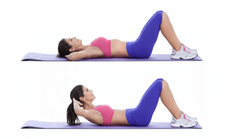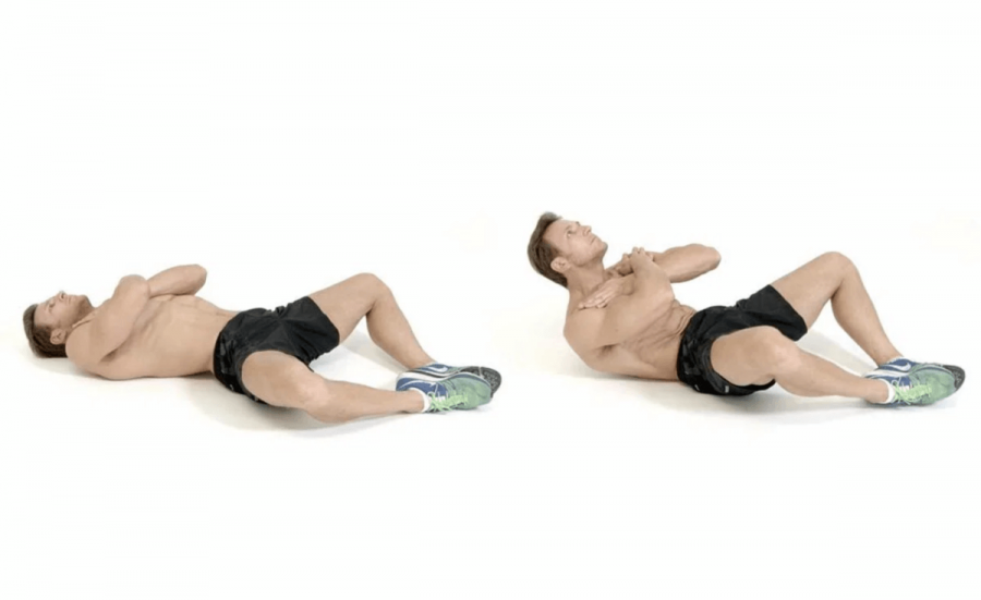 Начальная позиция аналогична предыдущему движению, но руки следует соединить в замок за головой либо скрестить в области грудной клетки. Начинайте поднимать корпус, напрягая при этом только мускулы живота. При обратном движении не опускайте туловище полностью на землю, что позволит удерживать таргетинговые мускулы под постоянным напряжением.