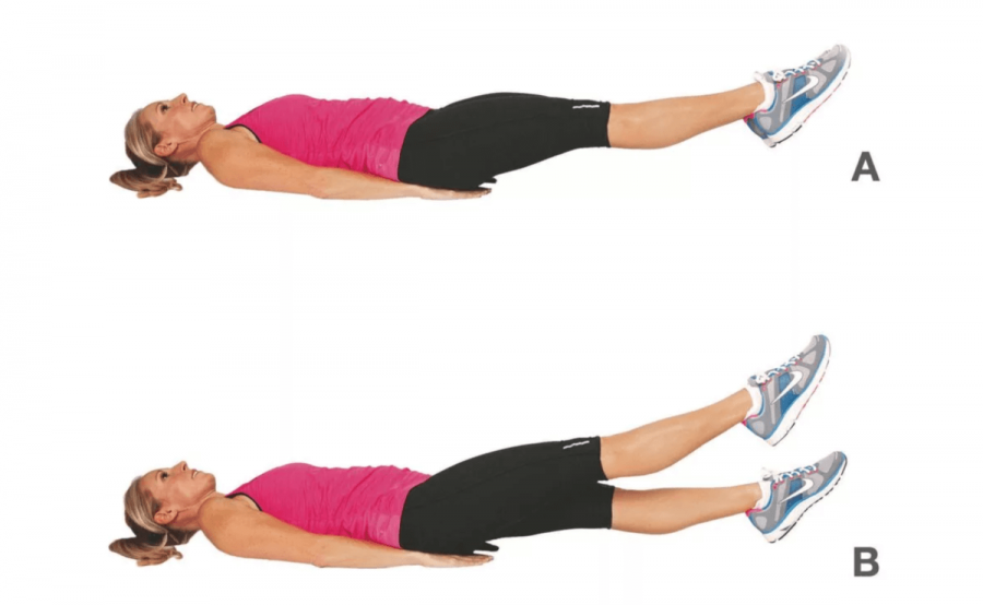 Это упражнение эффективно для нижней части пресса. Нужно лечь на пол, руки развести в сторону. Поднять ноги вверх, затем медленно их опустить. Ноги не нужно ронять на пол. Выполняя весь подход, держите их на расстоянии в пару сантиметров от пола.