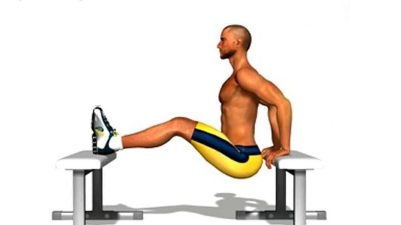 Это упражнение удобно выполнять, если в наличии у вас есть две скамьи или пара табуреток. Если этого нет, то ноги можно опустить на пол.