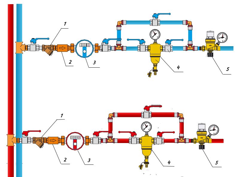 Но при установке до узла учёта должна исключаться любая возможность забора воды, а значит, технические пробки для промывки фильтра и штока окажутся запломбированы, а сам редуктор лишится возможности обслуживания. Этим можно пренебречь, но даже в таком случае очень сложно предусмотреть разное гидродинамическое сопротивление и добиться выравнивания давлений в коллекторах холодной и горячей воды. Нужно либо устанавливать в них дополнительные манометры для более точной подстройки, либо располагать регуляторы давления сразу перед коллекторами, как и поступает большинство опытных сантехников.
