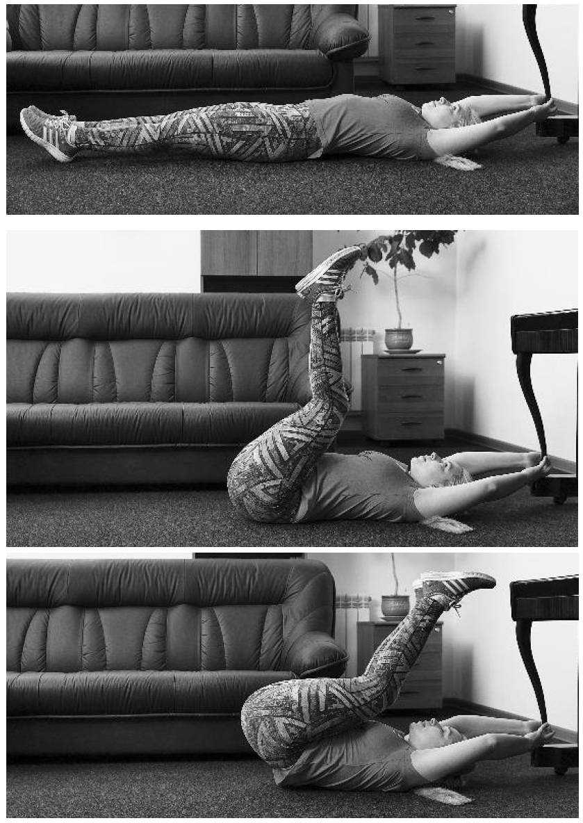 Руки сведены за головой, держатся за неподвижную опору или прижаты помощником. Распрямленные ноги поднимаются на выдохе, бедро прижимается к животу.