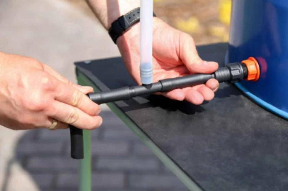 - К установленному кранику подключите дополнительный кусок магистрального шланга к подводу воды из бочки или водопровода либо к другой части отдельно орошаемой грядки, который в дальнейшем также будет подводиться к источнику воды через отверстие с фитингом типа «тройник».