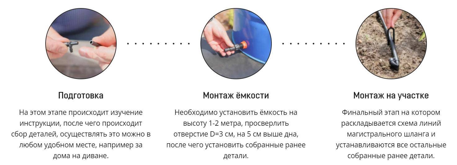 Собрать систему можно без специальных навыков и оборудования. Все комплектующие присутствуют в коробке, отдельно нужно приобрести только бочку или другую емкость для хранения воды. Работа по сборке состоит из следующих этапов.