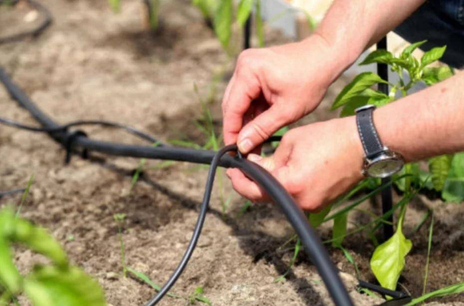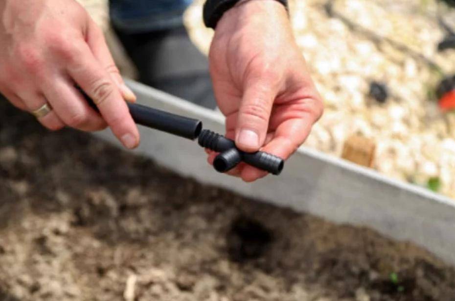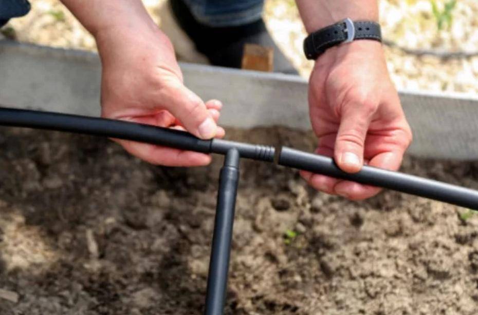 - Монтаж подводных капельных систем к магистральному шлангу. После соединения всех элементов пройдите на грядку для будущей интеграции в магистральный шланг. Напротив каждой пары растений, необходимо проделать отверстия шилом из комплекта.