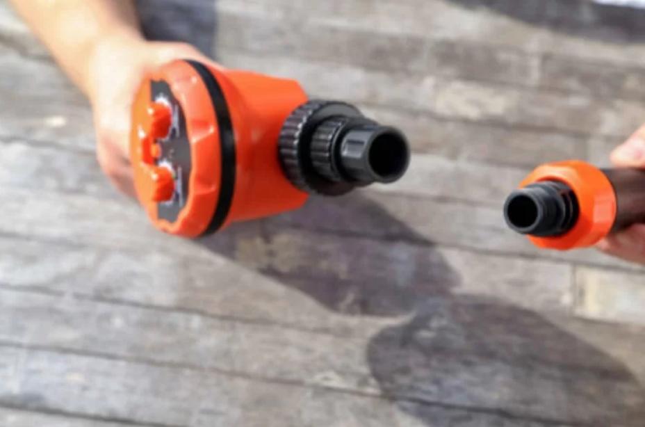 - На второй конец магистрального шланга наденьте специальный угол формы «Г» для дальнейшего подключения к системе подачи воды.